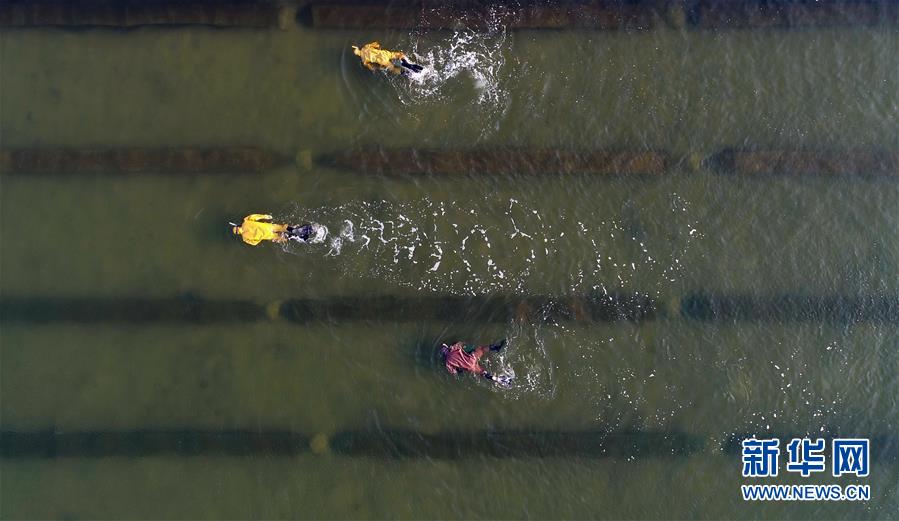 10月22日,樂亭縣姜各莊鎮(zhèn)二節(jié)村海參養(yǎng)殖基地的工人在捕撈海參(無人機拍攝)。 時下,正值渤海灣地區(qū)海參收獲時節(jié),河北省樂亭縣的海參養(yǎng)殖戶忙著捕撈海參,供應各地市場。據(jù)介紹,該縣海域水質優(yōu)良、氣候適宜,是海參養(yǎng)殖的理想場地,目前發(fā)展池塘造礁養(yǎng)殖海參面積6萬畝,年產鮮活海參6000多噸,年產值2億多元。 新華社記者 楊世堯 攝