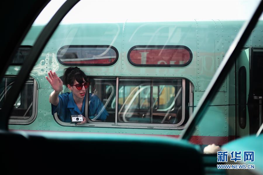 10月7日,在美國紐約舉行的巴士節(jié)上,一名女子在一輛老巴士上拍照。 新華社記者李木子攝