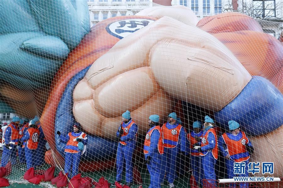 11月22日,在美國紐約感恩節(jié)大游行開始前,氣球操縱人員進(jìn)行準(zhǔn)備工作。