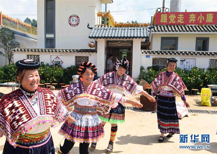 10月6日,在尋甸回族彝族自治縣塘子街道小海村,人們?cè)诖謇锏幕顒?dòng)廣場(chǎng)表演民間歌舞。國(guó)慶節(jié)期間,云南省尋甸回族彝族自治縣塘子街道小海村一片喜慶祥和。人們身著節(jié)日盛裝,載歌載舞,歡慶搬入新居后的第一個(gè)國(guó)慶節(jié)。新華社記者楊宗友攝