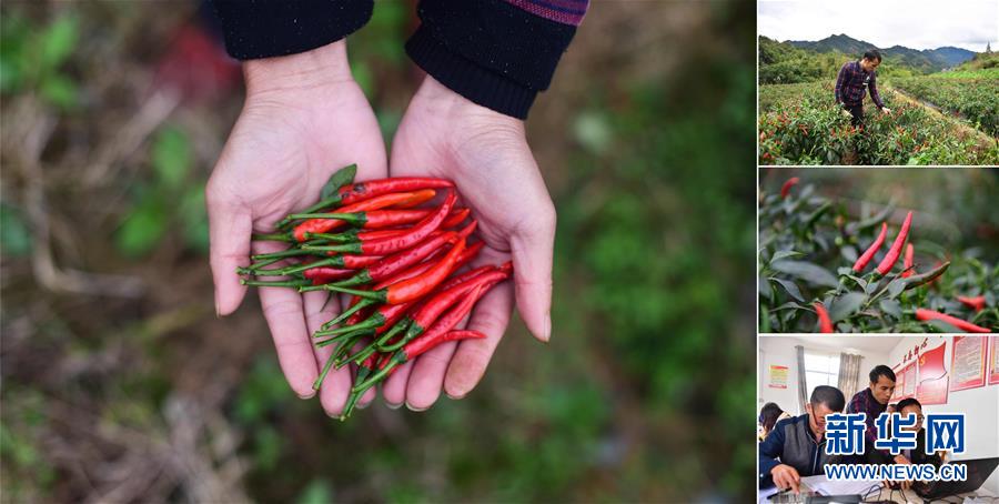 拼版照片:左圖為在大浪鎮(zhèn)大德村,龍德手捧剛剛收獲的辣椒;右上圖為龍德在摘辣椒;右中圖為合作社種植的辣椒;右下圖為龍德(中)在辦公室里工作(照片均攝于11月18日)。龍德是大德村的致富帶頭人,目前合作社種植有400多畝辣椒,帶動106戶貧困戶參與。 廣西融水苗族自治縣是國家扶貧工作重點縣,全縣“九山半水半分田”,生活生產環(huán)境較為惡劣,脫貧攻堅任務艱巨,目前還有7.68萬貧困人口。面對經濟發(fā)展落后、貧困面廣且程度深的現(xiàn)狀,當?shù)匕衙撠毠耘c創(chuàng)新產業(yè)扶持相結合,依托生態(tài)資源優(yōu)勢,實施“特色產業(yè)富民行動”,通過發(fā)展特色民族旅游、林下經濟和特色養(yǎng)殖業(yè)等扶貧產業(yè),帶動貧困群眾依靠勤勞的雙手,拔窮根摘窮帽,實現(xiàn)脫貧致富。據(jù)了解,目前全縣貧困戶參與特色產業(yè)發(fā)展的有2.9萬戶,扶貧產業(yè)覆蓋率達95%。 新華社記者 黃孝邦 攝