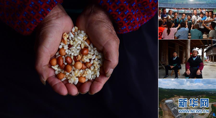 拼版照片:左圖為在廣西融水雙龍溝森林旅游度假區(qū)夢嗚苗寨,70歲的韋院媽手捧油茶原料:花生、油果、蔭米(11月20日攝);右上圖為韋院媽(左六)在景區(qū)里和游客們一起歡度苗族新禾節(jié)(7月18日攝);右中圖為韋院媽(右)在家里休息(11月20日攝);右下圖為夢嗚苗寨(7月19日無人機拍攝)。韋院媽是桿洞鄉(xiāng)錦洞村的貧困戶,今年3月,她和村里的13戶貧困戶一起舉家搬到雙龍溝森林旅游度假區(qū)打造的夢嗚苗寨,景區(qū)將貧困戶引入苗寨生活工作,保證貧困家庭有穩(wěn)定的收入。 廣西融水苗族自治縣是國家扶貧工作重點縣,全縣“九山半水半分田”,生活生產環(huán)境較為惡劣,脫貧攻堅任務艱巨,目前還有7.68萬貧困人口。面對經濟發(fā)展落后、貧困面廣且程度深的現(xiàn)狀,當?shù)匕衙撠毠耘c創(chuàng)新產業(yè)扶持相結合,依托生態(tài)資源優(yōu)勢,實施“特色產業(yè)富民行動”,通過發(fā)展特色民族旅游、林下經濟和特色養(yǎng)殖業(yè)等扶貧產業(yè),帶動貧困群眾依靠勤勞的雙手,拔窮根摘窮帽,實現(xiàn)脫貧致富。據(jù)了解,目前全縣貧困戶參與特色產業(yè)發(fā)展的有2.9萬戶,扶貧產業(yè)覆蓋率達95%。 新華社記者 黃孝邦 攝