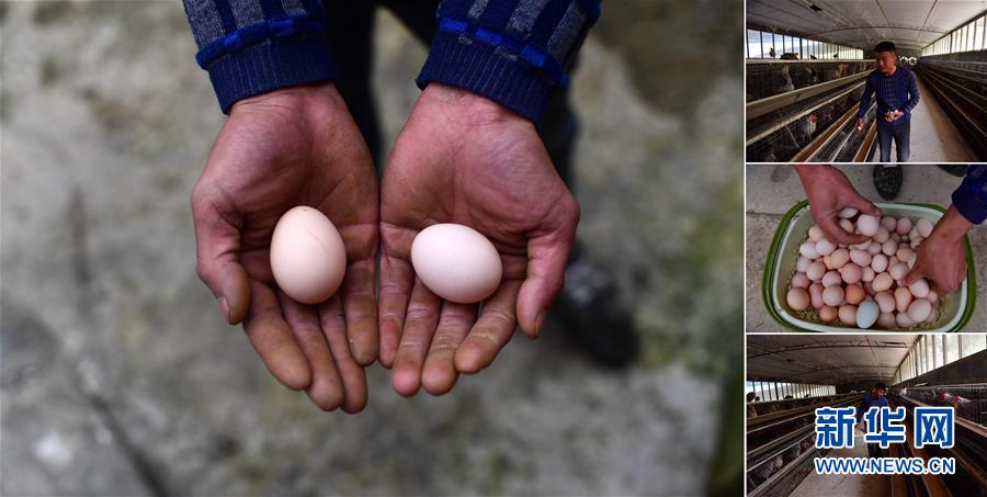拼版照片:左圖為貧困戶李先強手捧養(yǎng)殖合作社生產的雞蛋(11月19日攝);右圖為李先強在雞舍里撿雞蛋(照片均攝于11月19日)。李先強是融水苗族自治縣香粉鄉(xiāng)香粉村的貧困戶,從2016年開始,他和15個貧困戶一起發(fā)展土雞養(yǎng)殖。目前合作社養(yǎng)有3000多只雞,年產雞蛋1萬多斤。 廣西融水苗族自治縣是國家扶貧工作重點縣,全縣“九山半水半分田”,生活生產環(huán)境較為惡劣,脫貧攻堅任務艱巨,目前還有7.68萬貧困人口。面對經濟發(fā)展落后、貧困面廣且程度深的現(xiàn)狀,當?shù)匕衙撠毠耘c創(chuàng)新產業(yè)扶持相結合,依托生態(tài)資源優(yōu)勢,實施“特色產業(yè)富民行動”,通過發(fā)展特色民族旅游、林下經濟和特色養(yǎng)殖業(yè)等扶貧產業(yè),帶動貧困群眾依靠勤勞的雙手,拔窮根摘窮帽,實現(xiàn)脫貧致富。據(jù)了解,目前全縣貧困戶參與特色產業(yè)發(fā)展的有2.9萬戶,扶貧產業(yè)覆蓋率達95%。 新華社記者 黃孝邦 攝