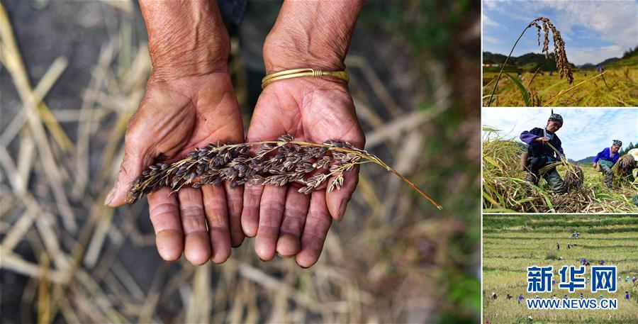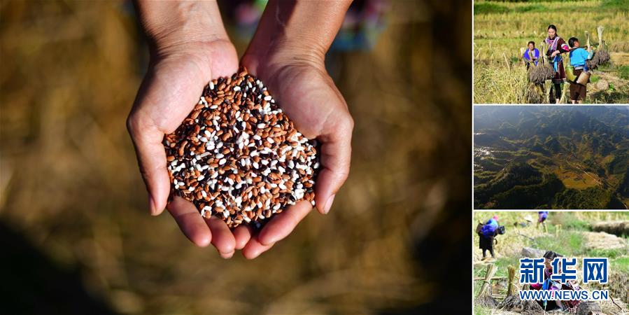 拼版照片:左圖為在安太鄉(xiāng)元寶村,合作社負責人謝秀萍手捧今年收獲的三色香糯;右上圖為合作社負責人謝秀萍(中)和社員們在收香糯;右中圖為位于苗山深處的香糯種植基地;右下圖為謝秀萍在收香糯(照片均攝于10月30日)。謝秀萍是當?shù)叵闩捶N植合作社負責人,帶動幾百戶貧困戶種植香糯。香糯是廣西融水大苗山的特產,它生長在高寒高海拔的特殊自然環(huán)境中,產量少,營養(yǎng)價值高。 廣西融水苗族自治縣是國家扶貧工作重點縣,全縣“九山半水半分田”,生活生產環(huán)境較為惡劣,脫貧攻堅任務艱巨,目前還有7.68萬貧困人口。面對經濟發(fā)展落后、貧困面廣且程度深的現(xiàn)狀,當?shù)匕衙撠毠耘c創(chuàng)新產業(yè)扶持相結合,依托生態(tài)資源優(yōu)勢,實施“特色產業(yè)富民行動”,通過發(fā)展特色民族旅游、林下經濟和特色養(yǎng)殖業(yè)等扶貧產業(yè),帶動貧困群眾依靠勤勞的雙手,拔窮根摘窮帽,實現(xiàn)脫貧致富。據(jù)了解,目前全縣貧困戶參與特色產業(yè)發(fā)展的有2.9萬戶,扶貧產業(yè)覆蓋率達95%。 新華社記者 黃孝邦 攝