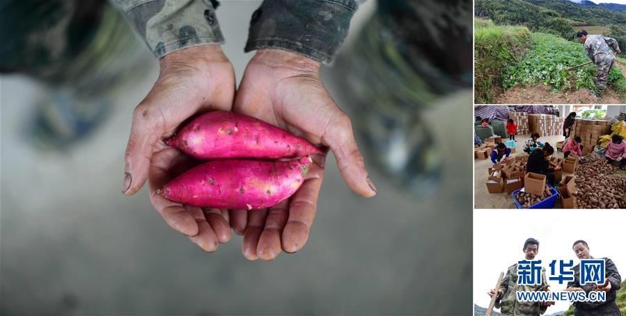 拼版照片:左圖為在大浪鎮(zhèn)桐里村,55歲的韋炳莊手捧剛剛收獲的高山紅薯;右上圖為韋炳莊在地里挖紅薯;右中圖為在縣城一個電商基地里,工作人員打包貧困戶種植的紅薯,準備發(fā)往全國各地;右下圖為韋炳莊(左)在地里挖紅薯(照片均攝于11月18日)。今年,韋炳莊種植3畝高山紅薯,每畝年產3000多斤,他家已于2016年實現(xiàn)脫貧。 廣西融水苗族自治縣是國家扶貧工作重點縣,全縣“九山半水半分田”,生活生產環(huán)境較為惡劣,脫貧攻堅任務艱巨,目前還有7.68萬貧困人口。面對經濟發(fā)展落后、貧困面廣且程度深的現(xiàn)狀,當?shù)匕衙撠毠耘c創(chuàng)新產業(yè)扶持相結合,依托生態(tài)資源優(yōu)勢,實施“特色產業(yè)富民行動”,通過發(fā)展特色民族旅游、林下經濟和特色養(yǎng)殖業(yè)等扶貧產業(yè),帶動貧困群眾依靠勤勞的雙手,拔窮根摘窮帽,實現(xiàn)脫貧致富。據(jù)了解,目前全縣貧困戶參與特色產業(yè)發(fā)展的有2.9萬戶,扶貧產業(yè)覆蓋率達95%。 新華社記者 黃孝邦 攝