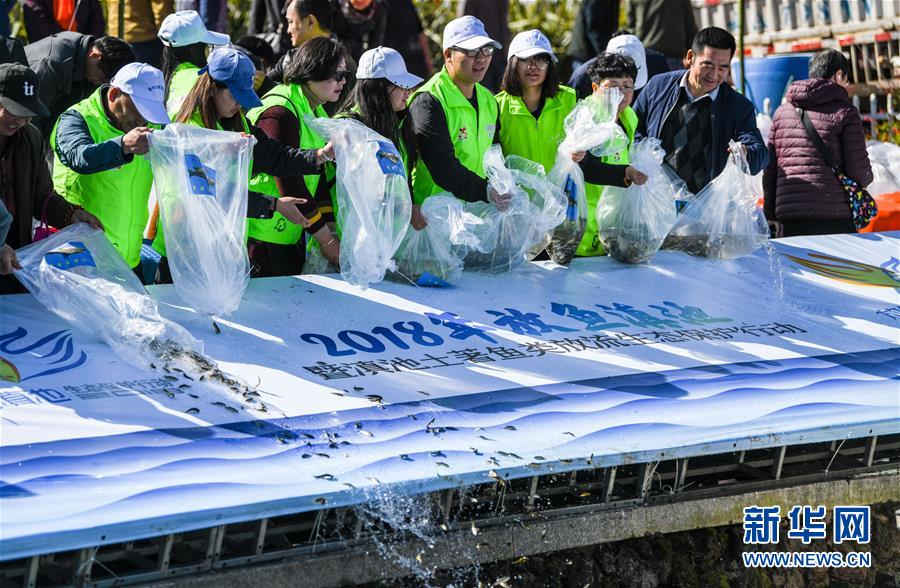 當日,“2018放魚滇池暨滇池土著魚類放流生態(tài)保護行動”在昆明滇池湖畔舉行,包括20萬尾滇池金線鲃、云南光唇魚在內(nèi)的滇池土著魚類以及5萬余尾鰱、鳙魚在滇池放流。 據(jù)統(tǒng)計,滇池最多的時候生活著24種土著魚,目前除了銀白魚自然存在外,2010年實現(xiàn)了滇池金線鲃的人工增殖放流,2017年又讓云南光唇魚實現(xiàn)了回歸。 新華社記者江文耀攝