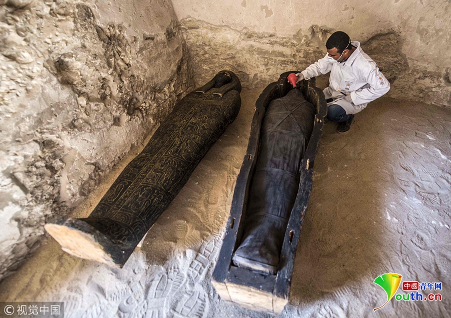 當(dāng)?shù)貢r(shí)間2018年11月24日,埃及盧克索,考古學(xué)家在當(dāng)?shù)匕l(fā)掘出一處墓穴,在其中發(fā)現(xiàn)石棺、木乃伊等文物,時(shí)間可追溯至公元前4-7世紀(jì)。圖片來(lái)源:視覺(jué)中國(guó)