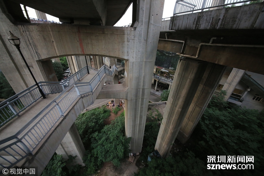 2018年5月29日,重慶,魔幻重慶又雙叒叕放大招!還有一個(gè)獨(dú)特的亮點(diǎn),重慶軌道交通3號(hào)線銅元局站,出口由一段長梯銜接上方立交橋和下方的路面,與全國最高城市立交橋蘇家壩立交組成了獨(dú)特風(fēng)景,許多游客專門趕來拍照。