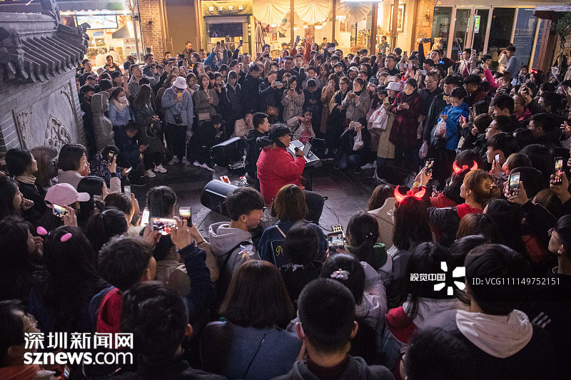 2018年4月6日晚,清明小長假的第二天,在山東省濟南市復古老街區(qū)寬厚里,暫停演出有段時日的網(wǎng)紅歌唱組合“連音社”悄然復出,吸引了當?shù)匾约皝碜匀珖鞯赜慰偷膰^。
