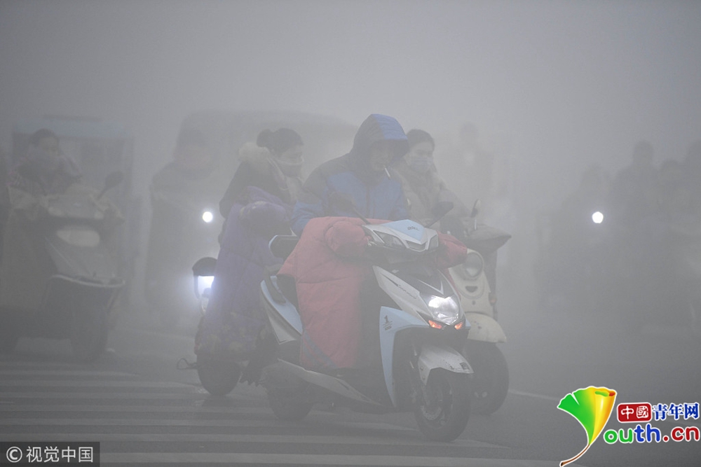 2018年11月26日,全國多地出現(xiàn)大霧天氣。安徽亳州,市民在大霧彌漫的街頭出行。