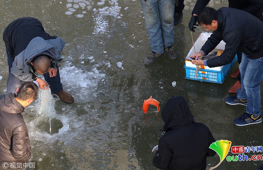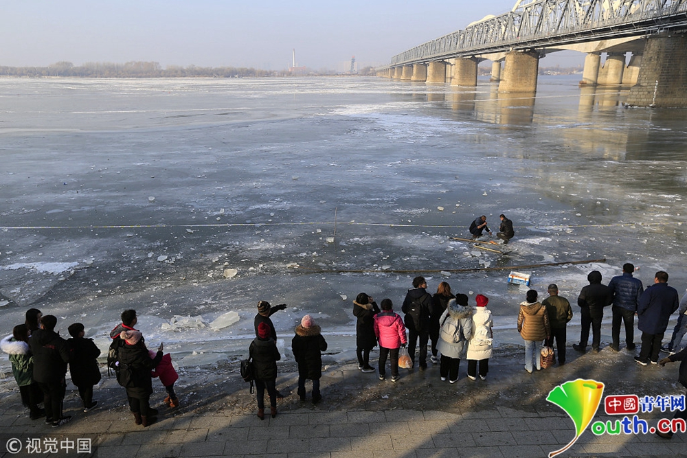 2018年11月25日,黑龍江省哈爾濱市,松花江封江不久,已經(jīng)有人蹬江鑿冰下網(wǎng)捕魚。 圖片來源:視覺中國
