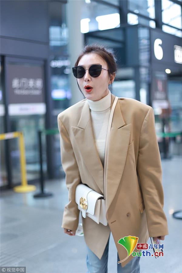 11月29日,上海,秦嵐現(xiàn)身機場。她戴白色鴨舌帽,穿白色星星圖案外套配微喇牛仔褲,架黑超涂紅唇笑靨如花。