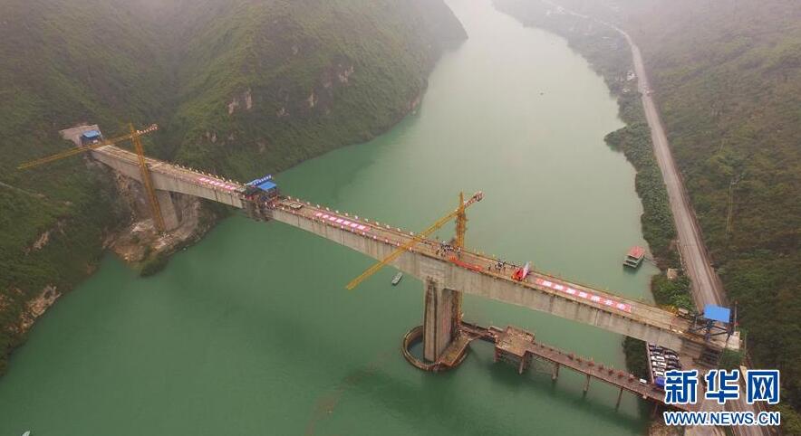 在重慶涪陵拍攝的渝懷鐵路涪秀二線重點(diǎn)工程——烏江右線大橋(10月23日無人機(jī)拍攝)。10月23日,由中鐵四局承建的渝懷鐵路涪秀二線重點(diǎn)工程——烏江右線大橋主跨成功合龍,標(biāo)志著大橋主體工程全部順利結(jié)束。烏江右線大橋項(xiàng)目全程460.1米,主跨192米,跨越烏江和319國道。在兩年多的建設(shè)過程中,施工人員攻克了“不等高墩”“不對稱邊跨”“邊跨入隧”等多個技術(shù)難題。新華社記者王全超攝