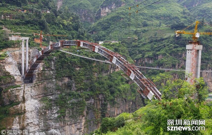 畢都高速公路北盤江大橋是杭瑞高速公路畢都段的控制性工程,位于貴州省和云南省交界處,由貴州省和云南省共建。該橋橋面至江面高差達(dá)565米,成為目前世界第一高橋。主橋?yàn)殇撹炝盒崩瓨颍骺?20米,目前位居同類型橋梁2016年12月29日正式通車。
