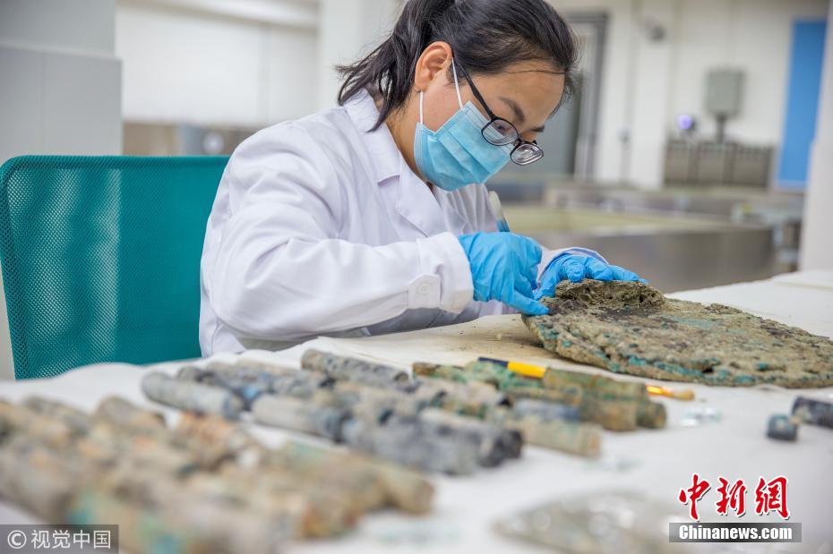 近日,廣東省博物館文物保護(hù)科技中心出水文物保護(hù)實(shí)驗(yàn)室里,宋薇正在清理一塊南澳一號(hào)出水的銅料,由于長(zhǎng)期浸泡在水里,文物留有海洋生物,一塊牡蠣殼仍留在銅料上。譚慶駒 攝 圖片來(lái)源:視覺中國(guó)