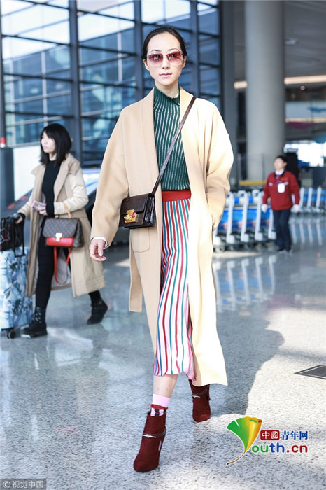 2019年1月17日,上海,韓雪現(xiàn)身機(jī)場,穿著條紋紗裙露出小腿,十分抗凍,她搭配經(jīng)典的駝色大衣,氣質(zhì)出眾在機(jī)場人群中相當(dāng)搶鏡。