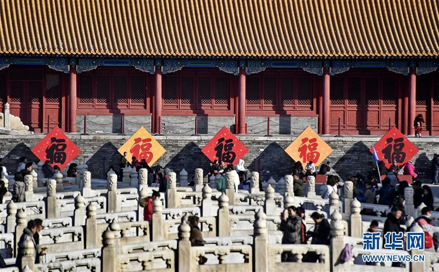 1月25日,游人在故宮內(nèi)的“五?!鼻傲粲?。 春節(jié)將至,北京故宮博物院內(nèi)張燈結(jié)彩,到處懸掛著宮燈、萬(wàn)壽燈、年畫(huà)、門(mén)神、福字等古代宮廷節(jié)日裝飾品,讓來(lái)自國(guó)內(nèi)外的游人感受到濃濃的年味。 新華社記者 李欣攝
