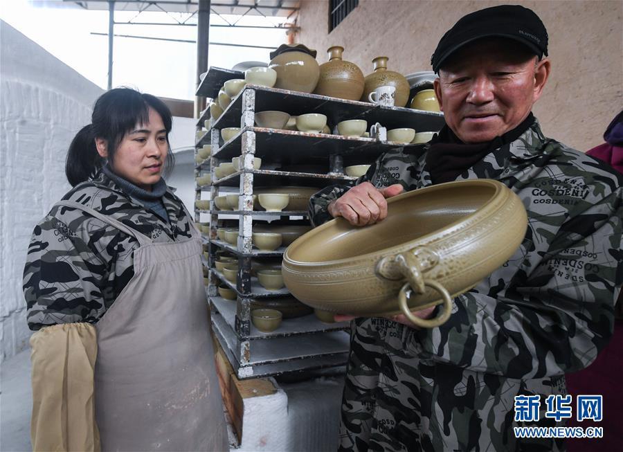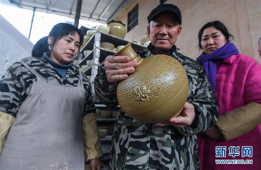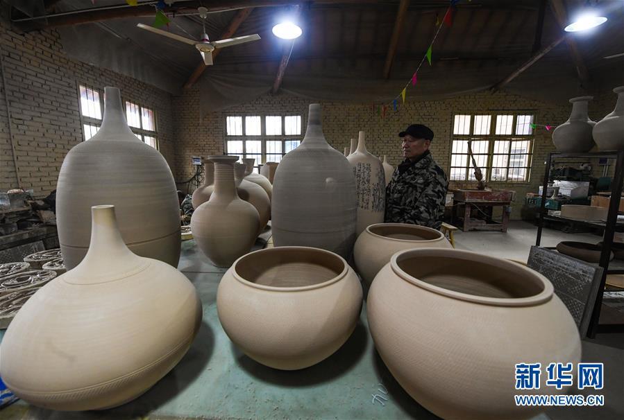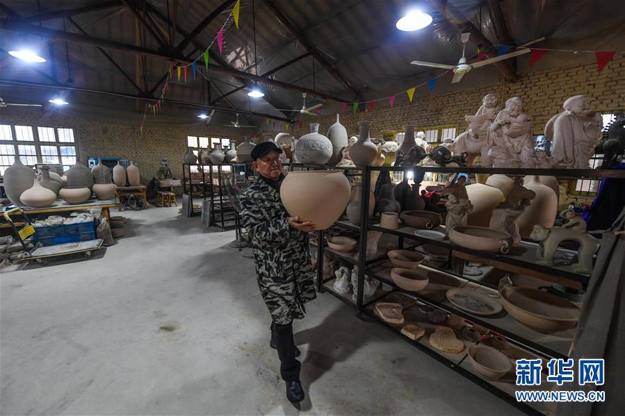 2月16日,陳新華在工作室中查看準備進行燒制的素坯。新華社記者 徐昱 攝