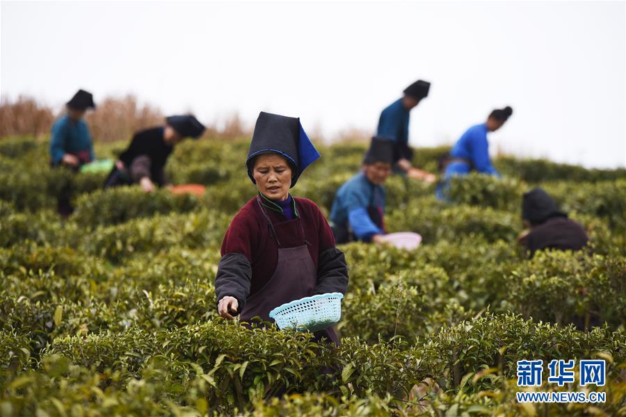 3月17日,采茶工在丹寨縣龍泉鎮(zhèn)羊甲村的茶園里采摘春茶。新華社記者 楊文斌 攝