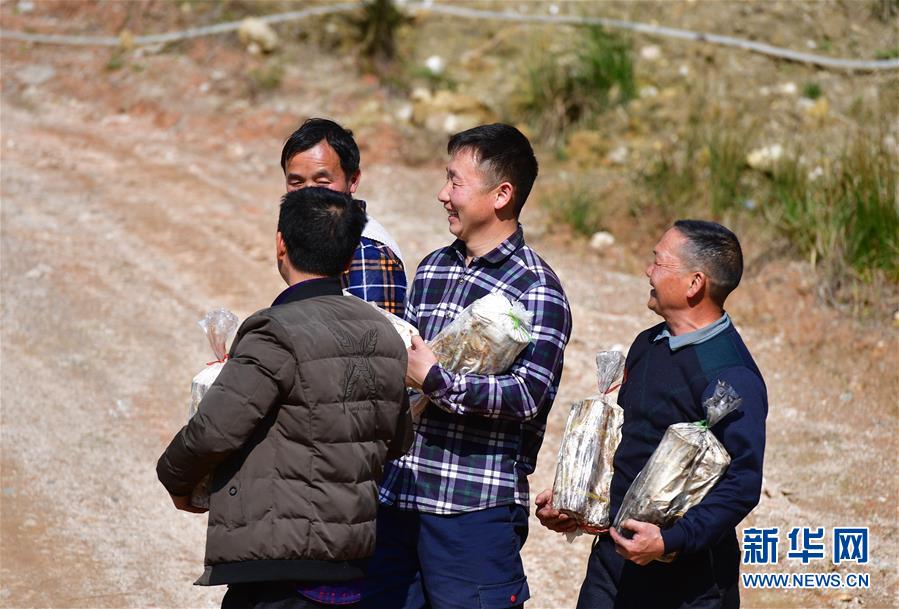 在廣西融水苗族自治縣桿洞鄉(xiāng)堯告村,貧困戶在苗坪嶺藥材種植專業(yè)合作社里領取靈芝菌棒(3月11日攝)。