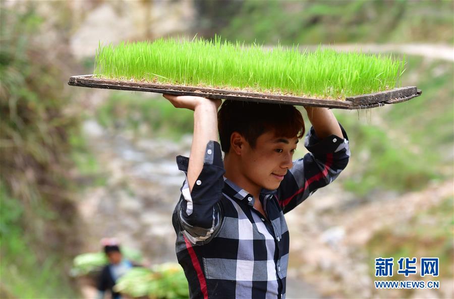 在黔桂烏英苗寨,村民搬運秧苗去插秧(4月17日攝)。 新華社記者 黃孝邦 攝