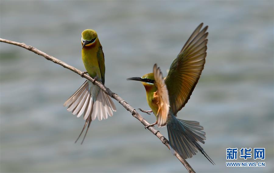 5月14日,兩只栗喉蜂虎在樹(shù)枝上嬉戲。