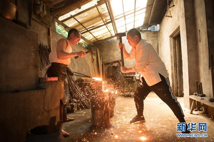5月21日,鄭國榮和兒子鄭劍威在“古越劍鋪”對坯料進(jìn)行鍛打。 鄭國榮,1964年生于浙江龍泉,已經(jīng)跟寶劍打了30多年的交道。1982年他作為學(xué)徒進(jìn)入龍泉市寶劍廠,1994年劍廠改制后,成立了工作室“古越劍鋪”,開始獨立的鑄劍生涯。 從兵器到精神的象征,鄭國榮一直對寶劍懷有敬畏之心。在他的工作室,一把寶劍,從理念形成、圖紙設(shè)計、備料到制作整合一般需要兩三個月。自劍鋪成立以來,他已帶了20多個徒弟,如今都成了有名的鑄劍師。他的兒子也在畢業(yè)后跟隨他鑄劍,目前已基本掌握了全流程的鑄造技藝。 新華社記者翁忻旸攝
