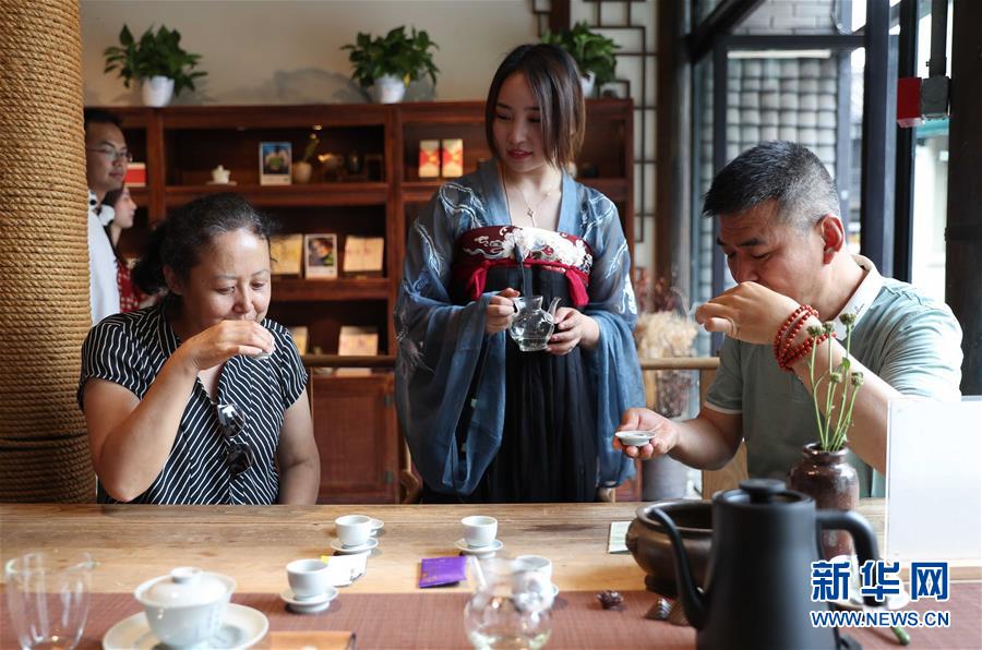6月9日,在成都寬窄巷子古今茶語(yǔ),兩位來(lái)自太原的游客參與品香猜茶互動(dòng)游戲。新華社記者 江宏景 攝