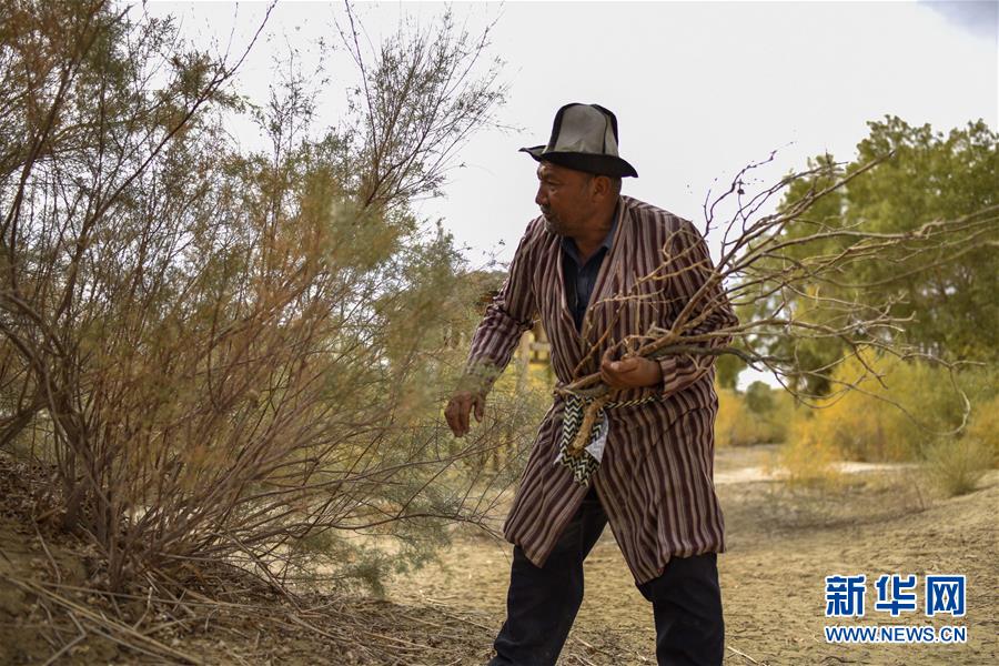 在羅布人村寨,阿木東·艾不東在準(zhǔn)備用于制作羅布烤魚(yú)的紅柳(2018年10月16日攝)。新華社記者 趙戈 攝