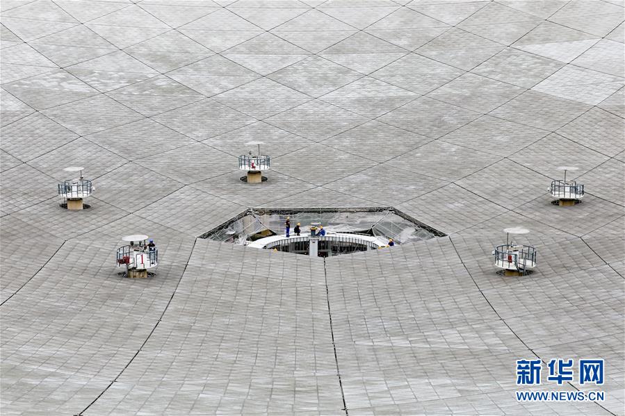 8月28日,工作人員在對FAST反射面板進行檢修。 新華社記者 歐東衢 攝