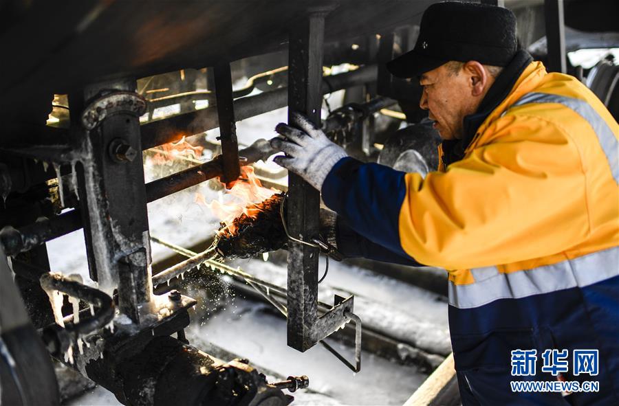 因?yàn)槎緶囟冗^低,送水員黃衛(wèi)東在蓄水前需要提前加熱閥門(1月17日攝)。新華社記者 許暢 攝