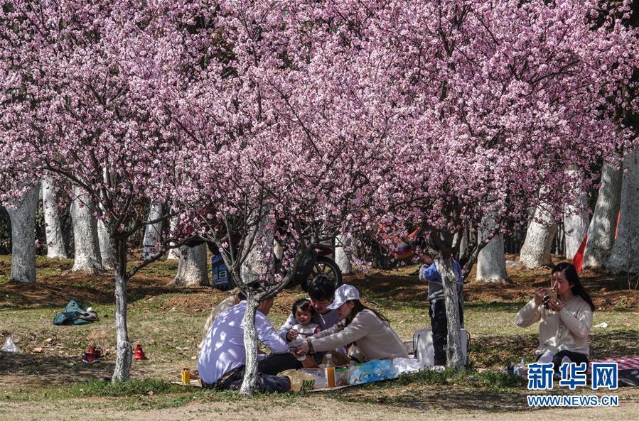 3月15日,在南京東郊體育公園,市民在櫻花樹下休息賞櫻。 當日,南京風(fēng)和日麗,市民們來到東郊體育公園,踏青春游。 新華社記者 楊磊 攝