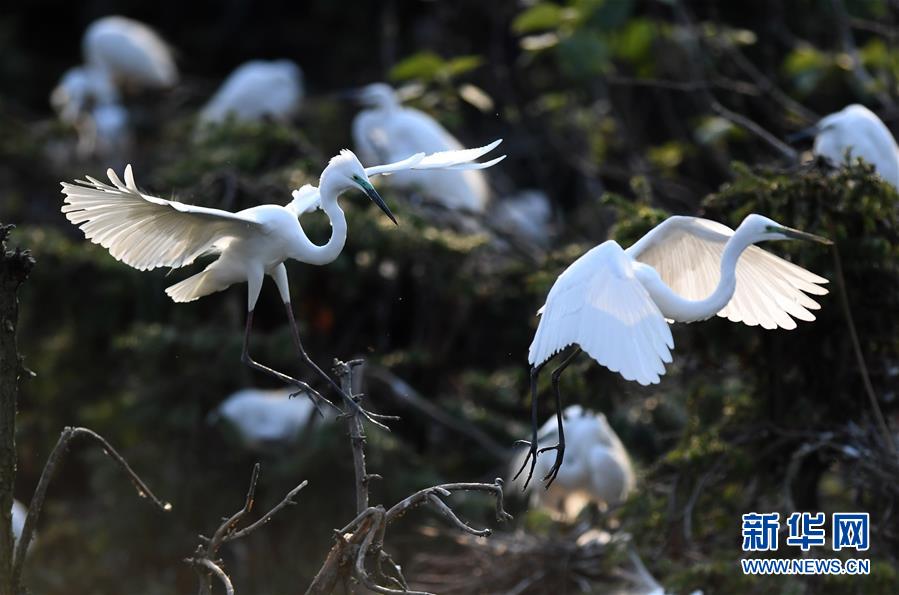 白鷺在位于鄱陽湖畔的南昌市象山森林公園內(nèi)棲息(4月27日攝)。近日,在江西省南昌市新建區(qū)象山森林公園內(nèi),已安家筑巢的大批白鷺進入繁殖旺季。在夕陽的照耀下,白鷺時而翩翩起舞,時而展翅盤旋,構成一幅美麗的自然生態(tài)畫卷。新華社記者萬象攝