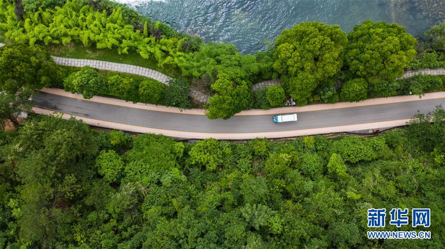 6月2日,車輛在阿哈湖國家濕地公園內(nèi)行駛(無人機(jī)照片)。初夏時(shí)節(jié),貴州省貴陽市阿哈湖國家濕地公園草木蒼翠,風(fēng)景如畫,吸引人們前來休閑游玩。新華社記者陶亮攝。