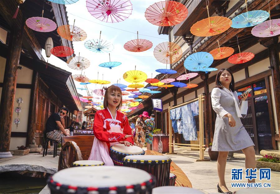 6月13日,在長春市世茂蓮花山小鎮(zhèn)寬厚里商街,一名古裝愛好者演奏手鼓。當日是“文化和自然遺產(chǎn)日”。吉林長春首屆蓮花山消夏生活節(jié)在世茂蓮花山小鎮(zhèn)舉行。活動將非遺展示與假日消暑休閑相結(jié)合,讓游人在“古色古香”的油紙傘巷中品傳統(tǒng)文化魅力,享夏日休閑愜意。新華社記者 許暢 攝
