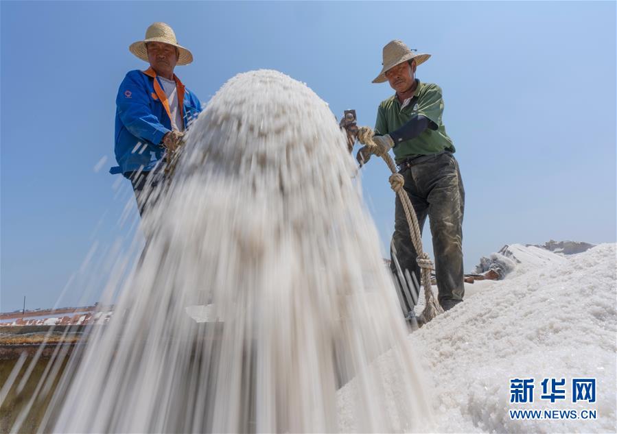 7月9日,唐山市曹妃甸區(qū)南堡鹽場的工人將收獲的春鹽裝船。在我國長蘆鹽區(qū)海鹽生產(chǎn)基地之一的河北省唐山市曹妃甸區(qū)南堡鹽場,一年一度的春鹽收獲工作即將結(jié)束,今年南堡鹽場的春鹽產(chǎn)量預(yù)計可達72萬噸。新華社記者楊世堯攝