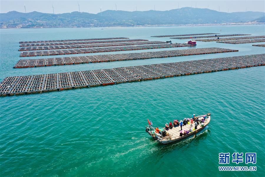 7月14日,漁船行駛在福建省連江縣新型漁排鮑魚養(yǎng)殖區(qū)域(無人機(jī)照片)。新華社記者 姜克紅 攝