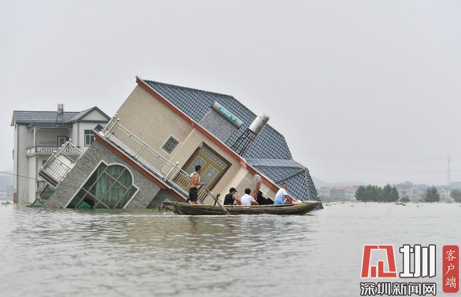 2020年7月15日,江西省鄱陽縣油墩街鎮(zhèn)同興村,村莊受到洪水圍困,大部分村民已經(jīng)被轉(zhuǎn)移出去,仍有少數(shù)村民選擇留守家中積極自救繼續(xù)生活。7月8日晚,鄱陽縣油墩街鎮(zhèn)西江因特大暴雨出現(xiàn)漫堤決口,5個行政村被洪水圍困,數(shù)萬名群眾被及時疏散轉(zhuǎn)移。同興村村民張瑤康回憶起了當(dāng)時的場景,“水一下子就涌進(jìn)來,等緩過神來趕緊向二樓轉(zhuǎn)移一樓的物品。洪水來時只從一樓搶到了一些輕便易拿的東西,冰箱、洗衣機(jī)之類的大物件,至今仍浸泡在一樓水中?!?5日,記者跟隨張瑤康乘船回家,抵達(dá)后看到,一樓淹沒在水中,一個綁在二樓護(hù)欄的木梯成為進(jìn)出“家門”的唯一通道?!懊刻靹澊ゴ謇镞\送水和食物,家里有煤氣罐和灶臺。因為80多歲的老母親行動不便,我們選擇留守家中?!薄半m然對岸就有安置點,但還是更愿待在自己家里,一來是不愿意給政府添麻煩,二來能每天看著自己的房子心里踏實。”同興村村民張長來夫婦帶著剛剛領(lǐng)到的大米、方便面、飲用水乘船回到家中。記者在現(xiàn)場看到,隨著各方救援力量和物資的匯聚,被洪水圍困的村民生活雖有不便,但生活仍在繼續(xù)?!胺孔硬坏?,家就在,我們要積極面對,早日重建家園。”張瑤康告訴記者。