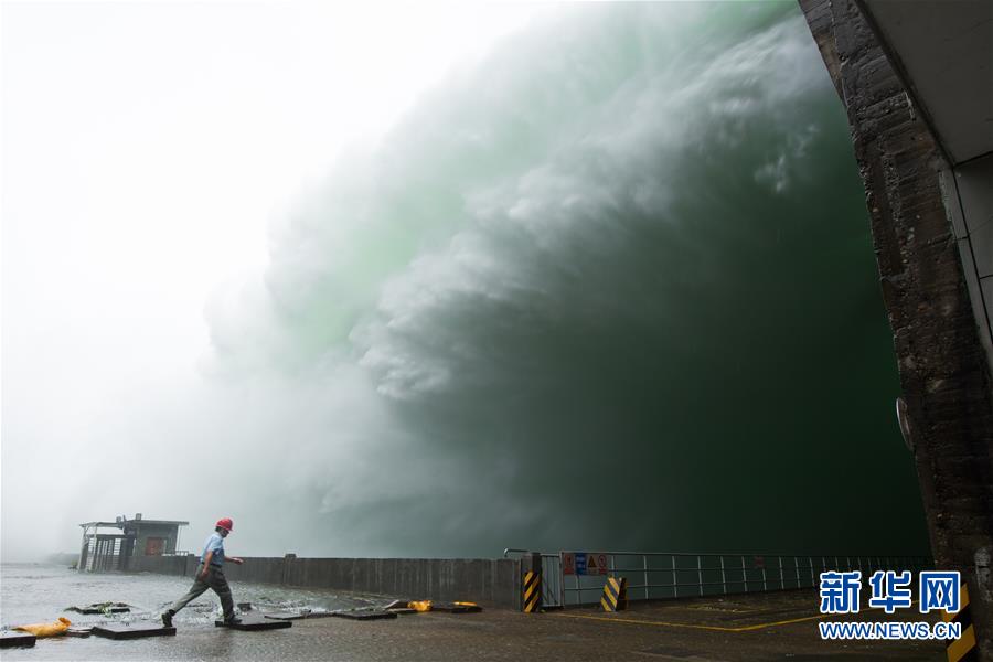 新安江電廠工作人員從正在泄洪的新安江水庫(kù)壩底經(jīng)過(7月7日攝)。新華社記者翁忻旸攝