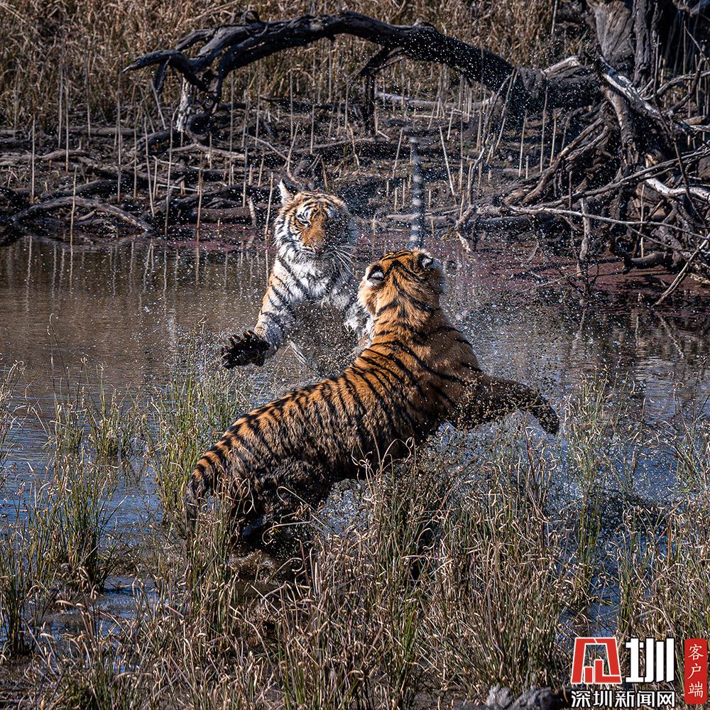 2020年7月27日,兩只老虎幼崽激烈的水上爭(zhēng)奪戰(zhàn)。