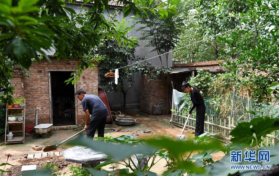 8月5日,王曉楠與父親在自家庭院內(nèi)勞作(無(wú)人機(jī)照片)。新華社記者郝源攝