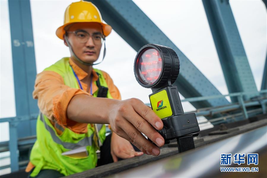 8月6日,防護員陳飛在南京長江大橋作業(yè)點安放施工作業(yè)防護燈。新華社記者李博攝