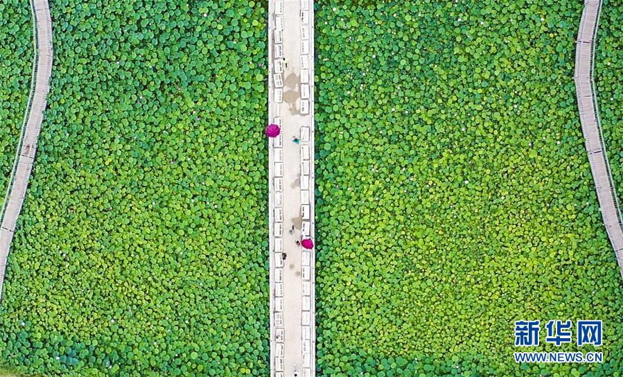 8月6日,游客在河北省永清縣里瀾城鎮(zhèn)金華湖觀賞荷花(無人機(jī)照片)。夏日時(shí)節(jié),河北省永清縣里瀾城鎮(zhèn)金華湖荷塘的荷花爭(zhēng)相開放,吸引市民和游客前來游玩觀賞。新華社記者李曉果攝