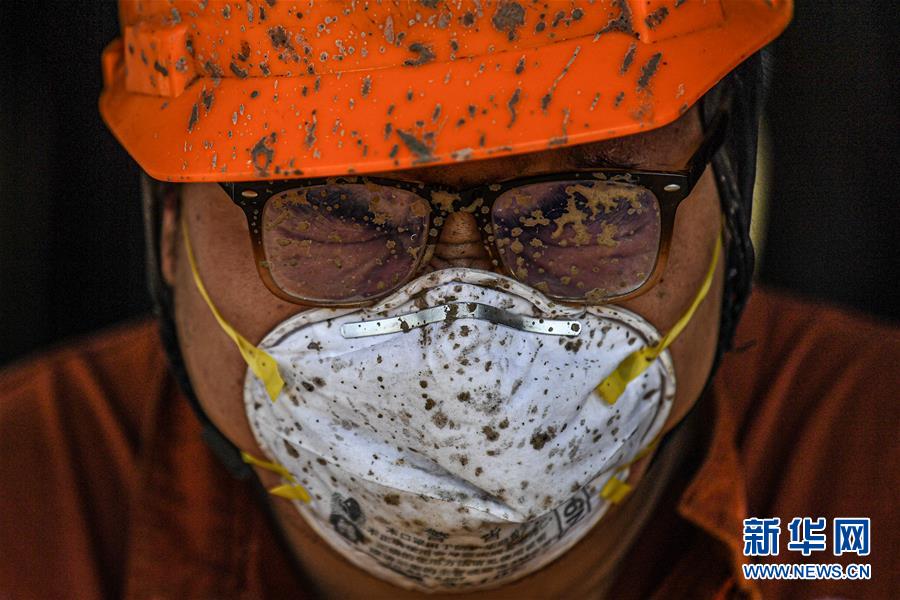 7月27日,在位于南海北部海域的勘探三號(hào)鉆井平臺(tái)上,一名鉆井工人在作業(yè)時(shí)眼鏡和口罩沾滿了泥漿。新華社記者蒲曉旭攝