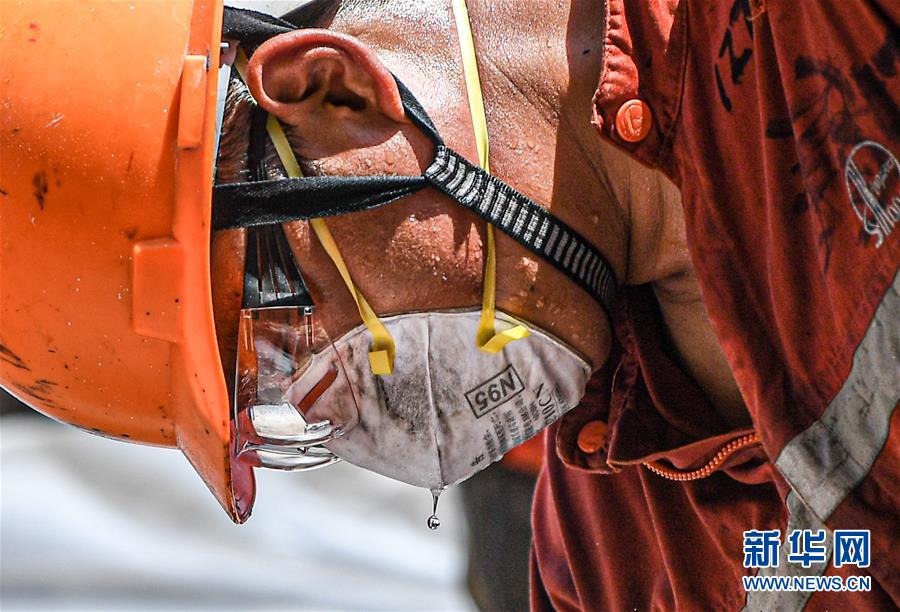 7月27日,在位于南海北部海域的勘探三號鉆井平臺(tái)上,一名鉆井工人在作業(yè)時(shí)汗水浸透了口罩。新華社記者蒲曉旭攝