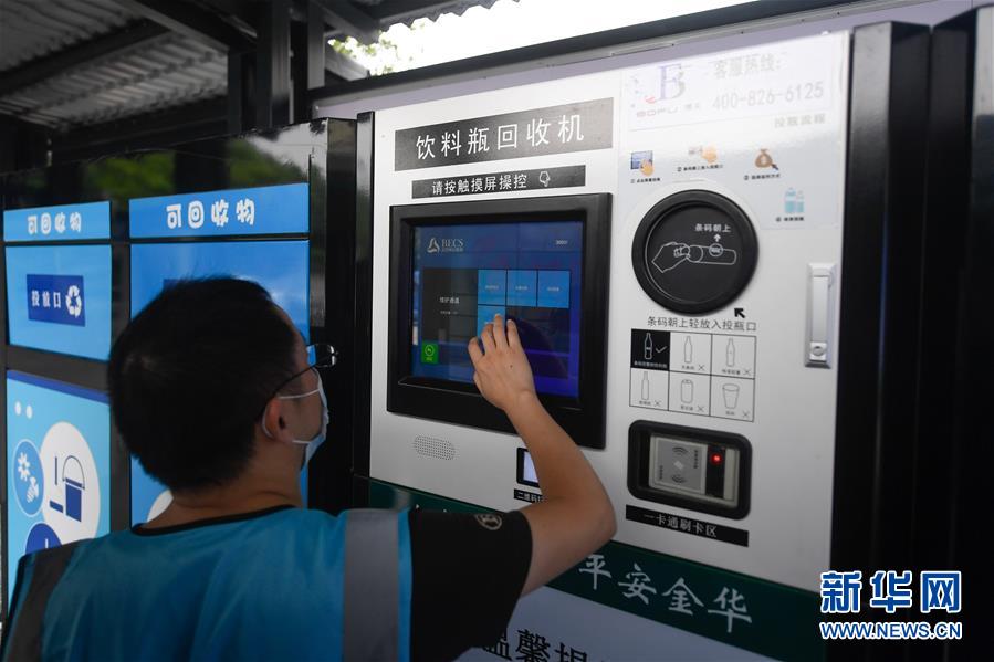 網(wǎng)格員在金華市金東區(qū)東孝街道一處垃圾分類投放點操作飲料瓶回收機(7月16日攝)。近年來,浙江省通過創(chuàng)新宣傳教育,多措并舉促進垃圾分類投放、收運及處置的良性循環(huán),引領(lǐng)垃圾分類成為城鄉(xiāng)居民的生活新風尚。新華社記者黃宗治攝。