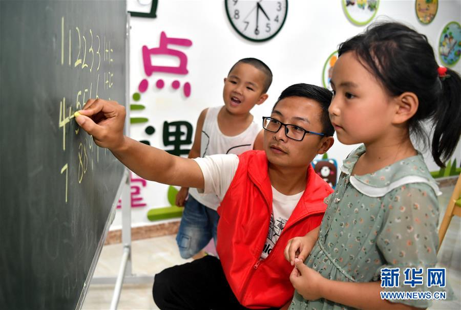 陜西安康市嵐皋縣城關(guān)鎮(zhèn)城北易地扶貧搬遷安置小區(qū)“四點半課堂”的老師在輔導孩子們學習數(shù)字(7月29日攝)。地處秦巴山區(qū)的嵐皋縣山多溝深,群眾居住分散,長期以來易地搬遷成為這里脫貧攻堅的重點。為避免易地搬遷群眾就業(yè)不充分、辦事不方便、管理不到位等問題,嵐皋縣依托市場完善社區(qū)生活、醫(yī)療、教育、娛樂等服務設施,并開展技能培訓、開辦社區(qū)工廠,讓搬遷居民“穩(wěn)得住”“能致富”。新華社記者劉瀟攝。