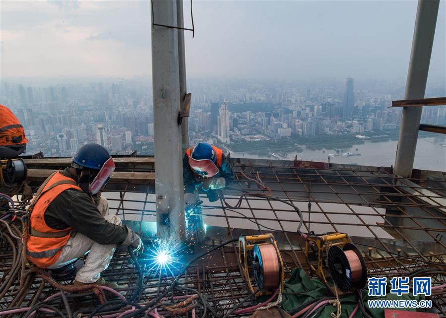 8月11日,工人在武漢綠地中心項目建設(shè)現(xiàn)場近500米的高空施工。新華社記者肖藝九攝