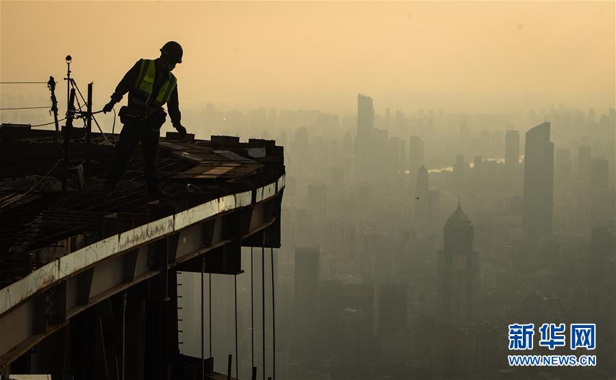 8月11日,工人在武漢綠地中心項(xiàng)目建設(shè)現(xiàn)場(chǎng)近500米的高空施工。新華社記者肖藝九攝