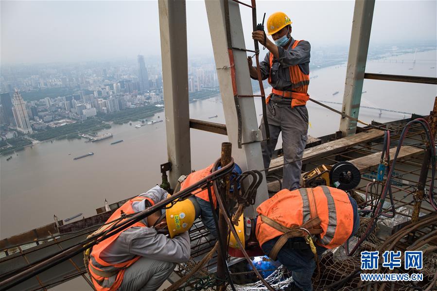 8月11日,工人在武漢綠地中心項(xiàng)目建設(shè)現(xiàn)場近500米的高空施工。新華社記者肖藝九攝